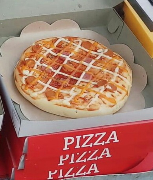 Pizza diameter 18 cm dengan topping potongan sosis. Lalu olesan saus tomat, mayonaise, dan saus keju