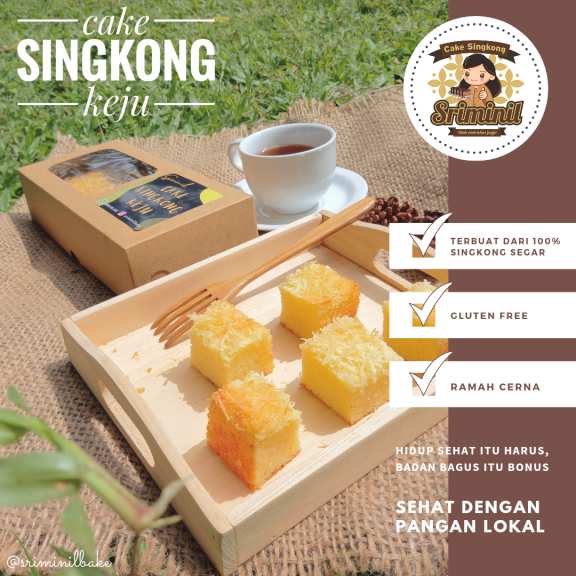 Cake yang berbahan baku singkong tanpa menggunakan tepung, dipadukan dengan topping keju panggang yang manis & gurih