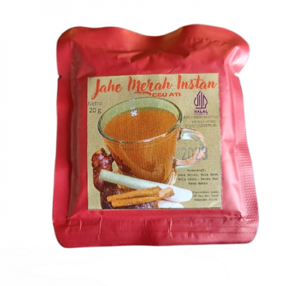 Jahe Merah Instan Ceu Ati 20 gram terbuat dari jahe merah, gula aren, gula pasir, sereh dan kayu manis.