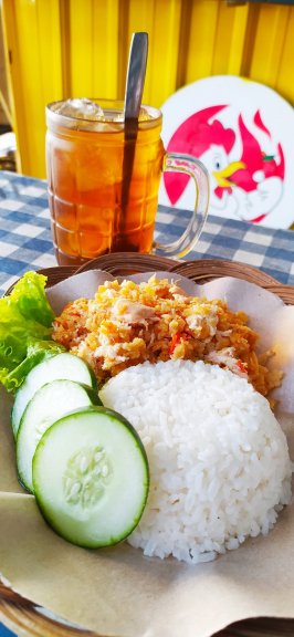 Nasi panas dengan ayam krispi di geprek dicampur sambal bawang kepedasan sesuai level, ditambah dengan lalapan