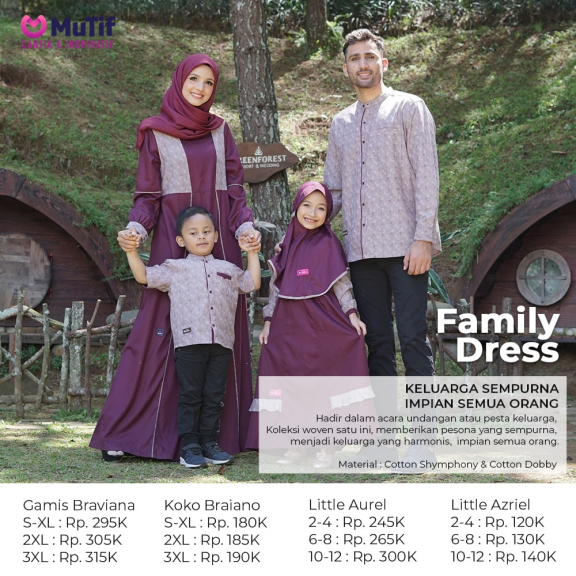 MUTIF SARIMBIT Braviana - Braviano (Braviana), Namanya Mutif Sarimbit Braviana - Braviano, lengkap untuk bunda Braviana, ayah Braviano, anak manis Aurel, dan anak jagoannya Azriel, Bahan Cotton shymphony & Cotton Dobby, jadi bahan yang tepat, karena kainnya yang lembut namun unik, memiliki serat yang menonjol sehingga, tampilannya special dan membuat semua orang terpana. Warna Mauve Wine dari Sarimbitnya, terlihat menawan, untuk menamani setiap acara keluarga, sehingga tampil percaya diri dan kompak, membuat semua orang ikut terpesona. Fitur Gamis Mutif Braviana : - Bukaan risleting depan - Kangcing wudhu friendly dipergelangan tangan - Saku dibagian samping Size Pack Gamis Braviana: Panjang Gamis (S :132 cm) (M : 134 cm) (L : 136 cm) (Xl : 138 cm) (XXL : 140 cm) (XXXL : 142 cm) Panjang Tangan (S : 56 cm) (M : 57 cm) (L : 58 cm) (Xl : 59 cm) (XXL : 60 cm) (XXXL : 61 cm) Lingkar Dada (S : 90 cm) (M : 94 cm) (L : 98 cm) (Xl : 102 cm) (XXL : 106 cm) (XXXL : 110 cm) Lingkar Pinggang (S : 84 cm) (M : 88 cm) (L : 92 cm) (Xl : 96 cm) (XXL : 100 cm) (XXXL : 104 cm)