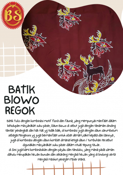 Batik Tulis dengan kombinasi motif flora dan fauna yang mempunyai manfaat untuk masyarakat Paser. Daun biowo,daun kombat,daun sarumbolum,lempinak dan payau