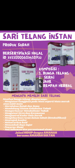 Sari Telang Instan, Minuman Serbuk Instan yang terbuat dari sari bunga Telang dan rempah rempah pilihan. Yang sangat berguna bagi kesehatan