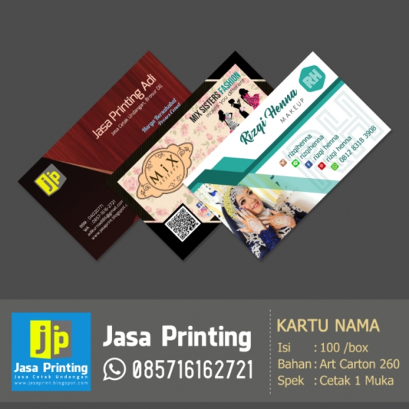 Jasa Printing Adi Jasa cetak undangan, brosur dll. Menyediakan jasa cetak Kartu Nama. Bahan : Art Carton 260 Isi : 100 lembar per box Cetak 1 Muka Full Colour