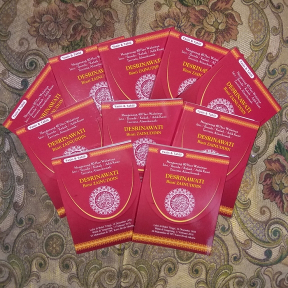 Cetak Yasin. Isi halaman : 190 s.d 220 halaman Bahan Kertas (isi) : HVS Cover : Art Carton 260 (di laminasi Glossy). Tambahan isi : Foto, Kata2 Ucapan dan Data Keluarga Yang Di tinggalkan.