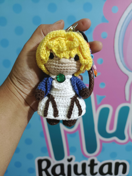 Anime key charms. Material benang katun lokal, lembut, ringan, bisa dicuci. Menggunakan safety eyes yang dijepit karet dari dalam sehingga tidak mudah lepas. Ring tebal dan berkualitas. 100% handmade.