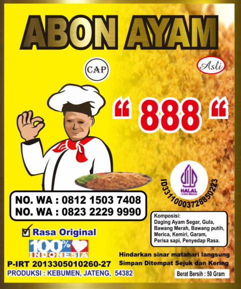 Produsen abon ayam merk 888..yang sudah ber produksi sejak 1980...dan baru di komersilkan di tahun 2019