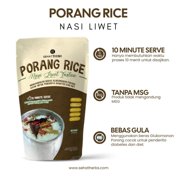 Nasi Porang adalah beras analog yang dibuat dari glukomanan porang atau sejenis umbi -umbian. Memiliki kalori yang lebih rendah sehingga cocok untuk dikonsumsi penderita diabetes dan diet.