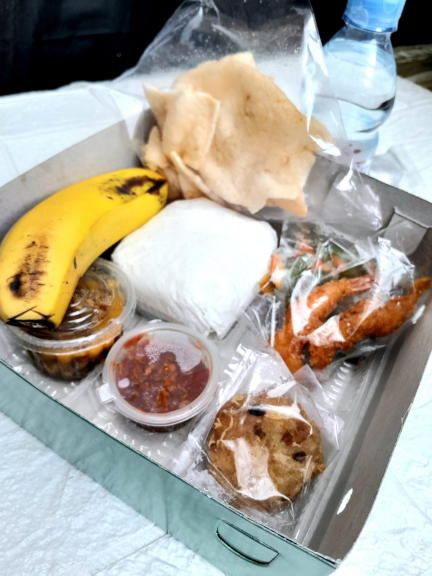 Nasi box yang berisikan ayam bakar, sambal, udang, buah, kerupuk, air mineral, tumis,