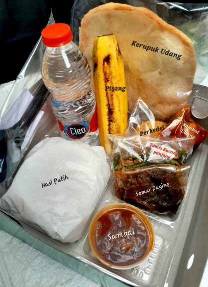 Nasi box dengan varian nasi daging sapi ikan tuna. tempe. Sayur krupuk buah air mineral