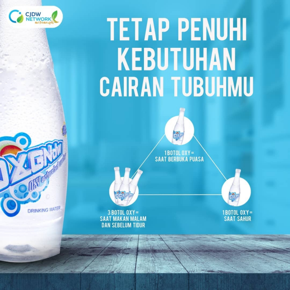 Oxygen Drinking Water, air minum beroxygendi produksi oleh Pt. Central Java Daya Wiguna Boyolali, Indonesia. BPOM RI MD 265511001292. Kelebihan air oxy: Air murni karena rendah mineral An. organik yang di perlukan tubuh ( TDS<2 PPM.