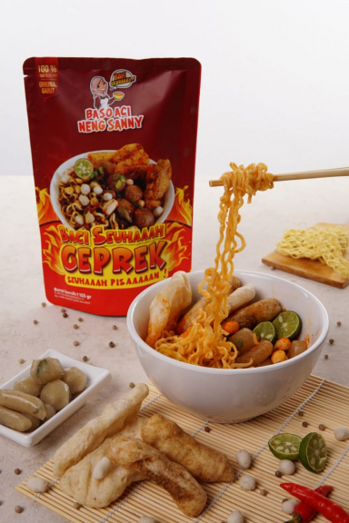 Baso Aci Neng Sanny adalah pelopor Baso Aci Online yang ada di Kota Garut dan merupakan makanan tradisional yang terbuat dari tepung tapioka serta berbahan dasar Premium dan berkualitas. Baso Aci Neng Sanny merupakan makanan ciri khas Kota Garut. Baso Aci Neng Sanny makanan Instan yang bisa di jadikan oleh oleh khas Kota Garut. Baso Aci Neng Sanny mempunyai 3 varian produk yaitu Baso Aci Original, Baso Aci Geprek dan Baso Aci Tulang Rangu. Baso Aci Neng Sanny sudah merambah ke berbagai kota dan Luar Pulau Jawa serta ke mancanegara (Malaysia, Singapura, Taiwan, Hongkong, Australia, Amerika, Swiss, Jepang, Dubai, Turki, Mekkah, Madinah). Jumlah Tenaga Kerja 10 orang. Perkembangan Usaha mulai dari penjualan online dengan sistem keagenan dan reseller serta sudah masuk ke toko oleh oleh Garut, Bandung, Cirebon, Pati Jawa Tengah, Tangerang bahkan ke Toko d Dubai, Swiss, Australia dan Asian Market di Amerika. Baso Aci Neng Sanny udah memiliki Halal, PIRT, NIB, Nutricion Fact. Berat Bersih +/- 140gr Isi Kemasan Instan Baso Aci 10pcs Mie Telor 1pcs Cuankie Lidah 2pcs Cuankie Tahu 2pcs Sukro Cikur 1klip Cabe Geprek 1klip Bumbu Instan 1klip Minyak Udang 1klip