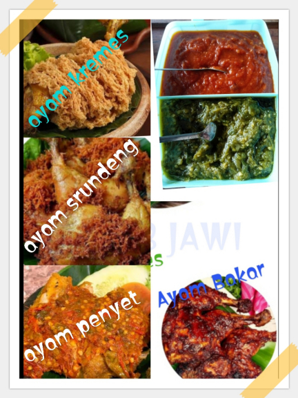 Tersedia berbagai menu ayam ada ayam kremes,ayam penyet,ayam bakar,ayam srundeng,tongseng ayam,soto ayam,sate ayam n paketan nasi box n snack