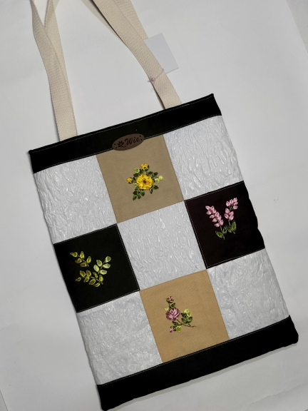Totebag dari hasil daur ulang kantong plastik dan perca kanvas dengan sulam pita sederhana. Size 30x40 cm Handle webbing katun Inner waterproof