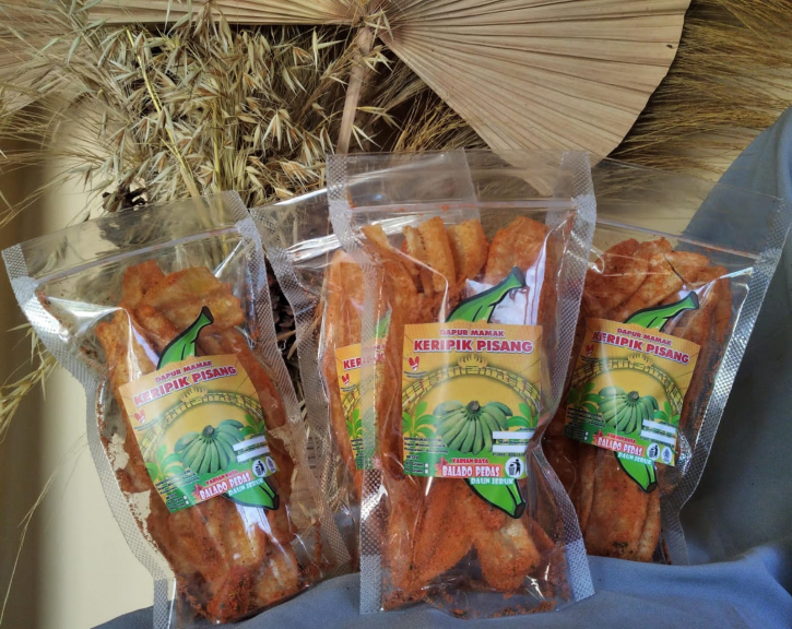 Keripik pisang kepok dengan varian rasa pedas daun jeruk..