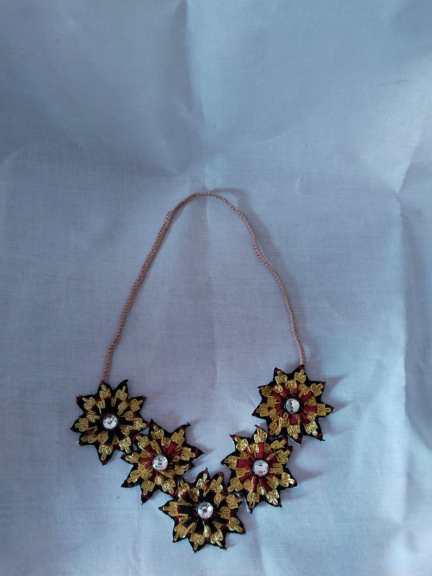 Kalung Tapis Lampung terbuat dari kain tapis yang berbentuk seperti bunga dan dihiasi mata mata cantik biar orang melirik ia tertarik