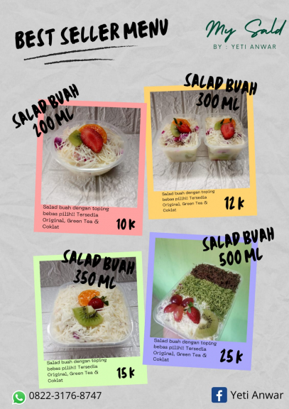 Menyediakan berbagai salad buah mulai dari ukuran 200 ml dengan harga 10 ribu