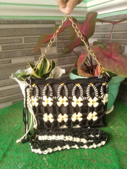 Tas rajut talikur dengan motif bunga melati, dengan 2 warna yg mewah cantik dan sangat elegan cocok di gunakan diberbagai acara formal dan non formal.