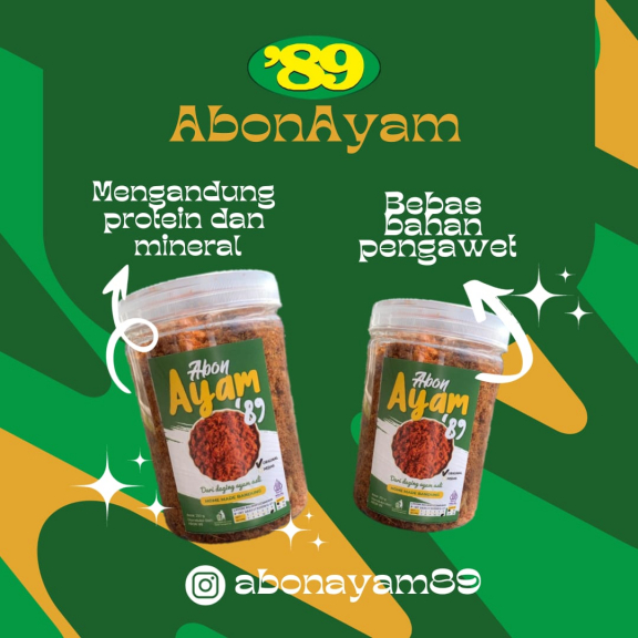 Abon ayam premium berasal dari Bandung, terdiri dari 100% daging ayam tanpa campuran apapun. Dibuat dengan bahan dan rempah pilihan. Tanpa menggunakan MSG, bahan pengawet, pewarna dan pemanis buatan.