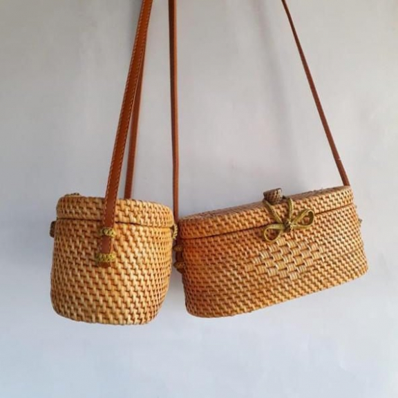 Tas berbahan dasar rotan yg dipadukan dengan kulit sapi