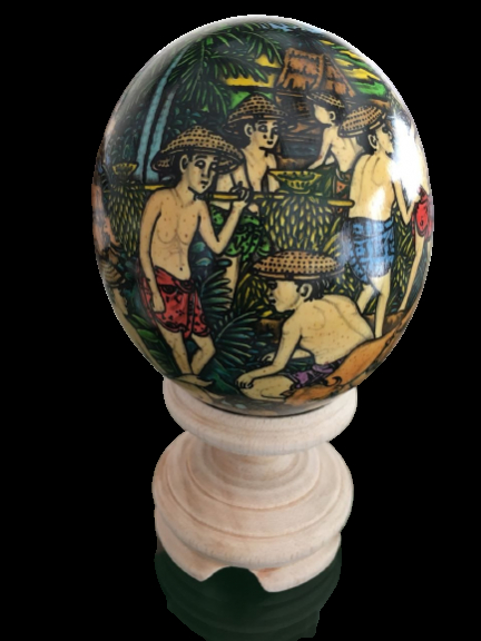 Cangkang telur burung Onta asli Motif gambar tradisonal adat Bali, pemandangan, hewan, cartun, dll (motif dapat digambar sesuai pemesanan)