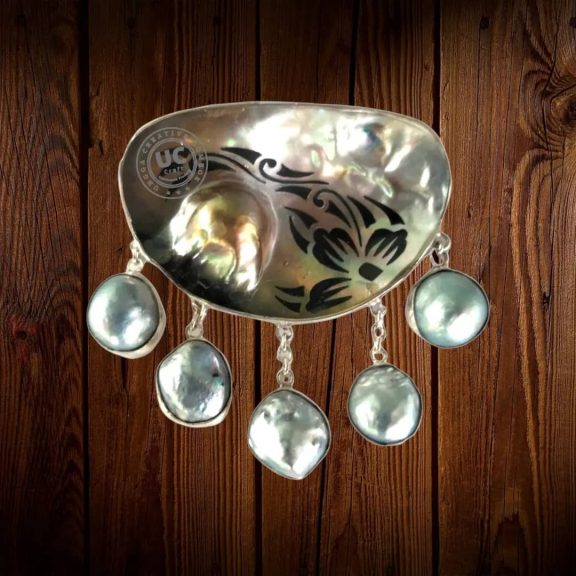 Kerajinan aksesoris berbahan Logam Perak dengan Kombinasi Kulit Kerang dan Mutiara Laut asli.