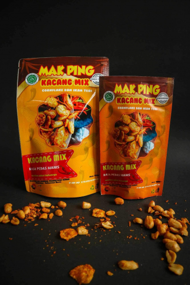 Cemilan Kacang Mix adalah produk utama dan best seller, campuran kacang, ikan teri dan cornflake dengan cita rasa pedas manis