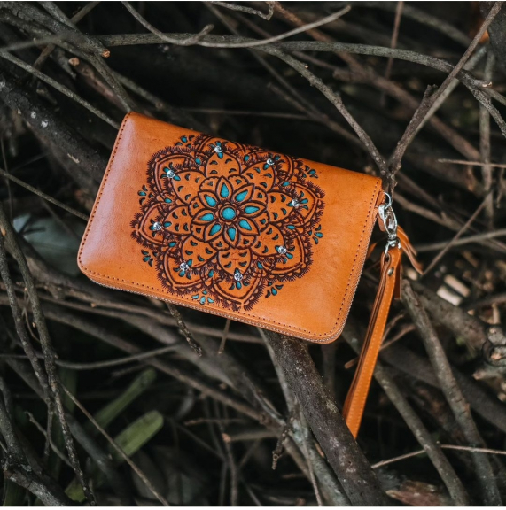 dompet bergaya bohemian dengan desain resleting sekeliling untuk keamanan. Terbuat dari kulit berkualitas, dengan slot kartu dan ruang koin, memberikan gaya dan fungsionalitas dalam satu produk yang legan.