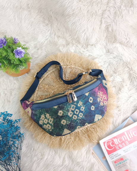 Waist bag terbuat dari bahan jumputan palembang motif tie dye kombinasi kain waterproof dengan aksesoris tali webbing adjustable. Size P = 35cm L = 8cm T = 14cm