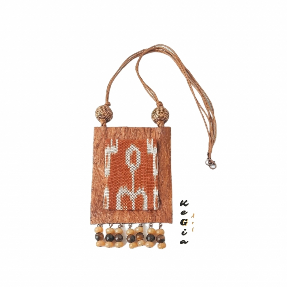 Kalung berbentuk persegi yang dari kulit kayu kapuak dikombinasikan dengan tenun ikat Dayak pewarna khas Kalbar dan tali kalung semi kulit Bahan kulit kayu Berat 41 gram Besar mata kalung 10 x 8 cm Panjang tali 62 cm