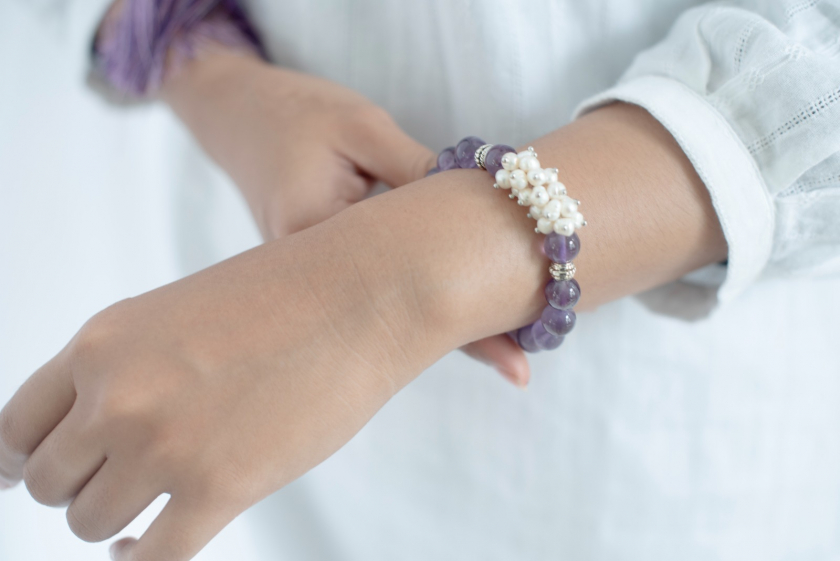 Gelang dari rangkaian batu Kecubung atau Amethyst di kombinasikan dengan mutiara air tawar membuat gelang ini cantik dan elegan.