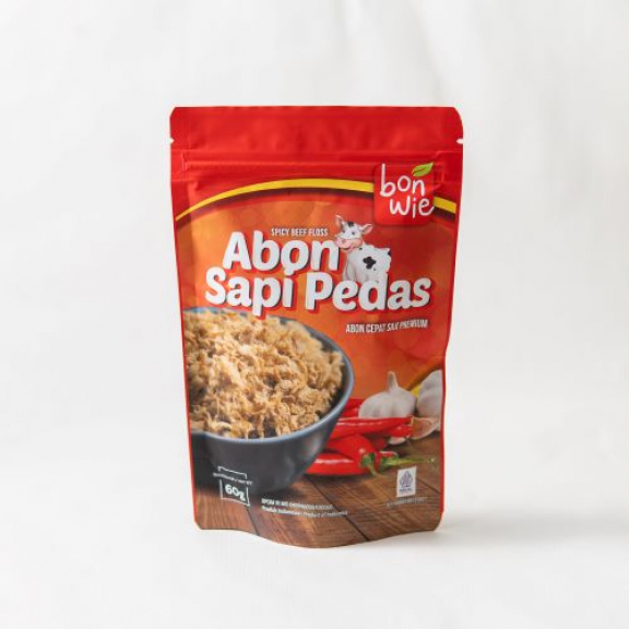Abon Sapi Pedas Bonwie terbuat dari daging sapi pilihan dan rempah-rempah berkualitas tinggi, tanpa bahan pengawet dan tanpa MSG. Rasanya pedas dan crunchy.Izin edar BPOM RI MD, sertifikasi Halal, dan perlindungan HKI, menjamin kualitas dan keamanannya.