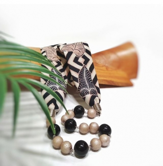 Kalung batik motif Wajik Godhong Lumbung dari Solo, memiliki makna kebijaksanaan dan kesejahteraan. Batik ini berbahan katun dengan proses cap, dikombinasikan dengan manik-manik warna senada. Panjang kalung 70 cm