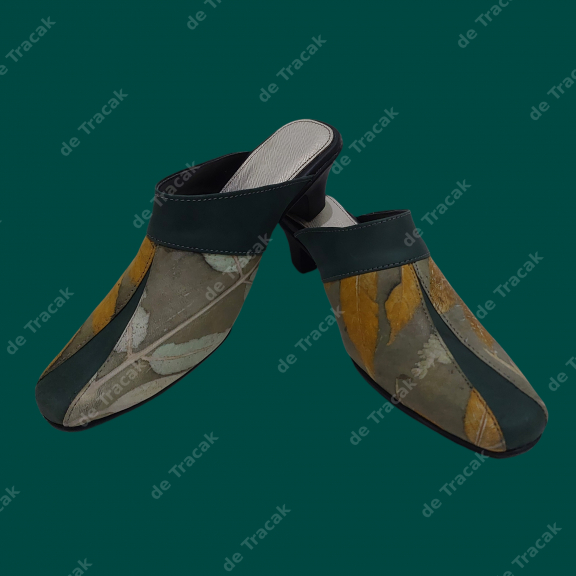 Selop wanita, berbahan kulit domba yang dipadukan dengan kulit sapi asli, bermotif natural asli dari tumbuhan, 100% menggunakan pewarna alami, dikerjakan secara handmade menggunakan teknik ecoprint