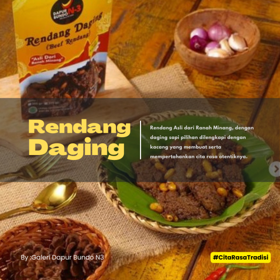 Rendang daging sapi iris terbuat dari daging sapi pilihan yang segar bagian has dalam dan dipadu dengan rempah asli ranah Minang yang dimasak selama 8 jam sehingga dagingnya empuk dan bumbunya meresap. Rendang ini ditambah campuran kacang khusus rendang.
