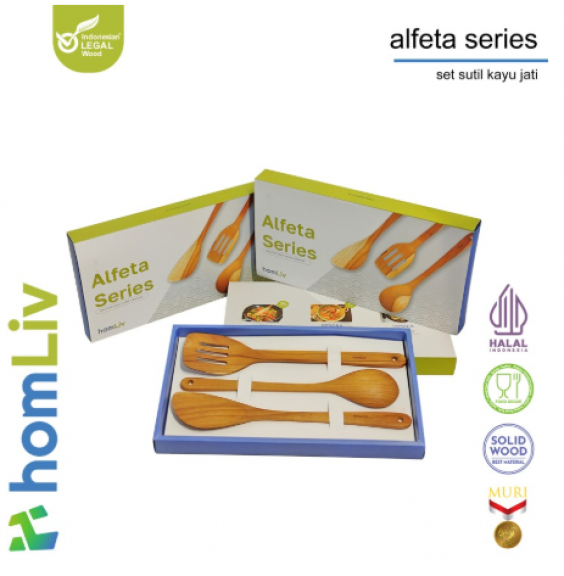 Alfeta set adalah hampers berisi 3 pcs sutil kayu jati yang sangat cocok digunakan sehari-hari. Alat masak kayu homLiv telah bersertifikasi halal dan melalui proses uji laboratorium (bebas pestisida dan pengawet kayu).