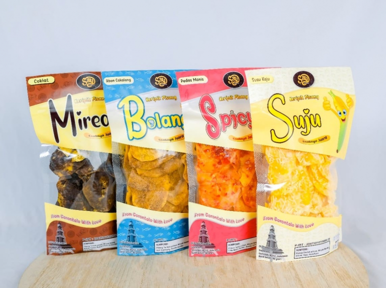 Keripik pisang yang mempunyai berbagai macam varian rasa yang unik dan best seller di antaranya susu keju, coklat mireo dan pedas manis