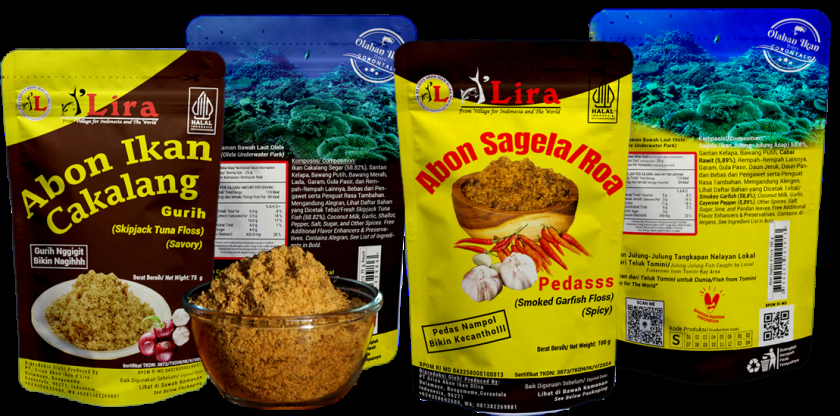 Abon Sagel/roa dan abon ikan cakalang dLira terbuat dari ikan julung-julung asap (sagela/Roa) pilihan, dan Ikan Cakalang Segar. Dipadukan dengan bumbu rempah-rempah pilihan, sertai cabai rawit segar.