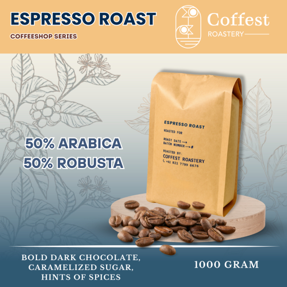 50% Arabika 50% Robusta Butuh custom blend dan custom roast profile sesuai keinginanmu dan kebutuhan coffeshop mu? Bisa banget! Langsung chat Admin untuk konsultasi!