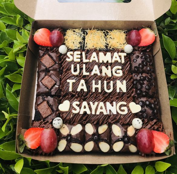 Fudgy Brownies dengan coklat filling, buah dan aneka topping Bisa custom topping dan tulisan