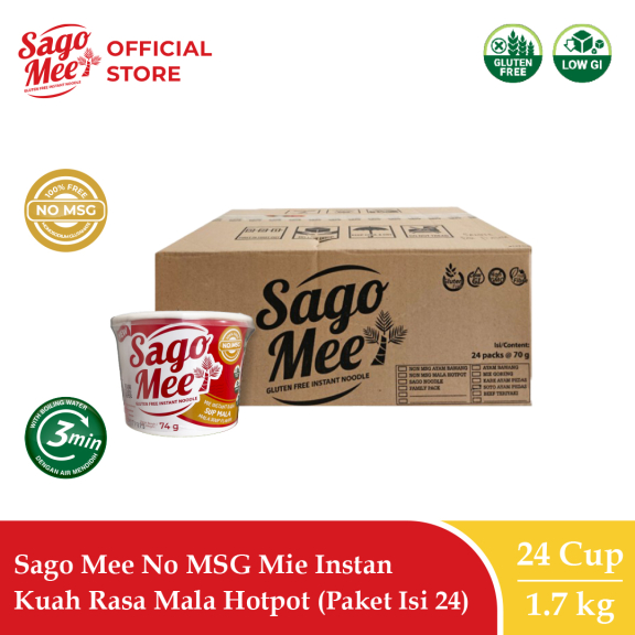 Sago Mee No MSG Gluten Free Rasa Soup Mala 74g Mie Instant Kuah Pertama di Indonesia yang Bebas Gluten, Rendah nilai Glycemic Index (GI), dan Tinggi Kandungan Pati Resisten. Praktis tinggal seduh dengan air panas mendidih.