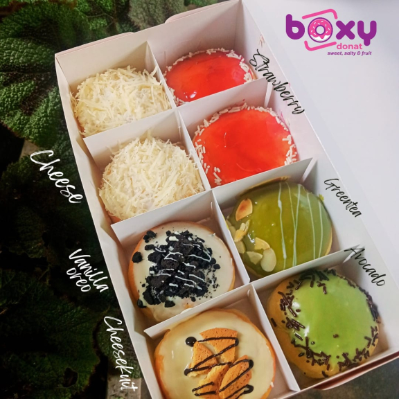donat boxy memiliki topping yang berinovasi sesuai selera konsumen yang kekinian. kami memiliki donat basic yang rasanya tdk terlalu manis, dan donat buah yang kami Olah dari buah asli dan juga donat savoury seperti donat ayam