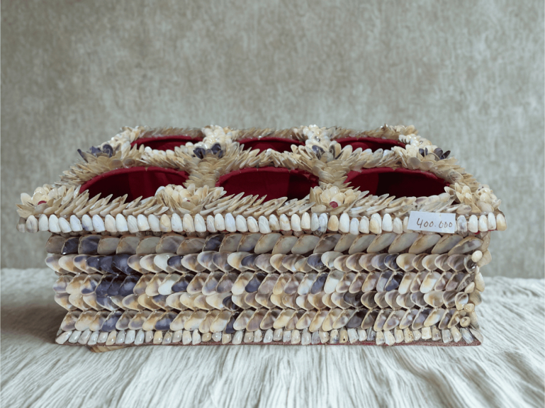 Tempat untuk menaru botol di meja tamu atau kantor. penyimpanan 6 botol aqua 600 ml. terbuat dari cangkang kerang