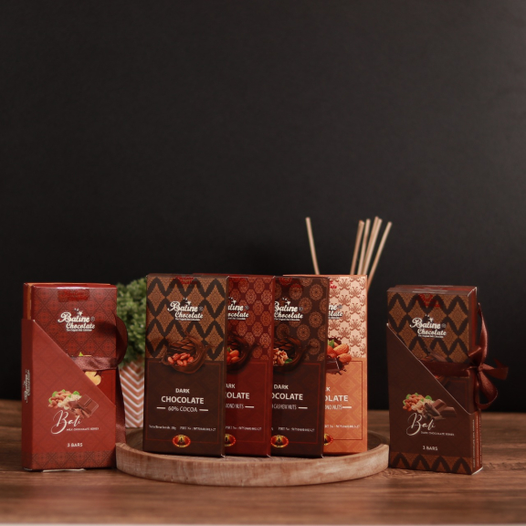 Produk bar dan praline yang dikemas dengan kemasan bertemakan budaya Bali