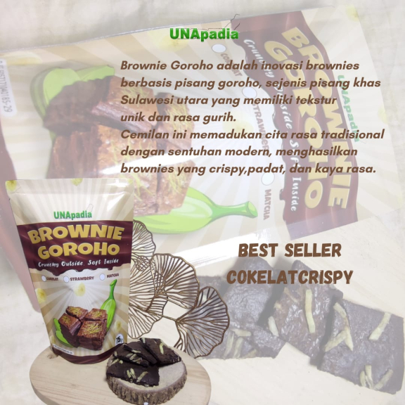 Brownie Goroho adalah perpaduan unik antara cita rasa klasik brownie dengan pisang lokal goroho khas Sulawesi Utara, menghasilkan camilan manis, legit, dan lembut yang kaya rasa dan aroma khas nusantara. Cocok sebagai teman santai dan oleh-oleh.