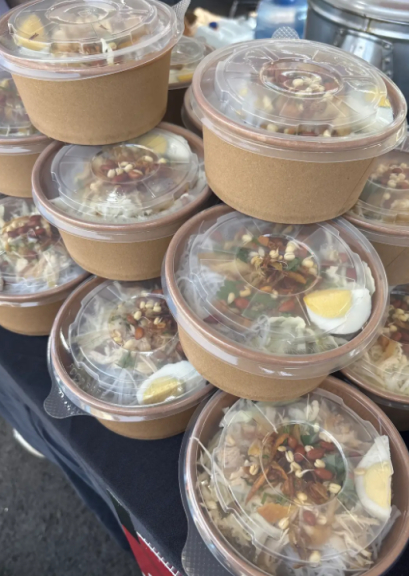 Soto ayam khas Pacitan dengan kuah bening gurih dan rempah melimpah, disajikan dengan suwiran ayam dan pelengkap khas.