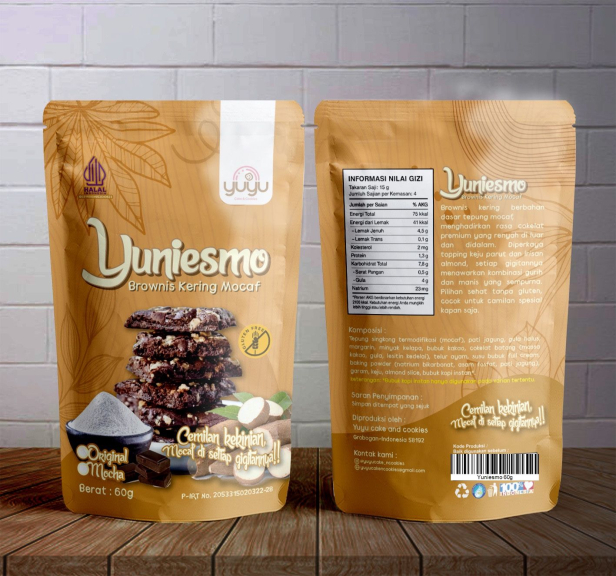 Yuniesmo adalah brownies kering tipis berbahan dasar tepung mocaf, cocok untuk pencinta camilan renyah. Dipanggang hingga kering, tiap kepingnya dilengkapi toping keju dan almond slice, memberikan perpaduan rasa gurih dan manis yang pas di lidah.