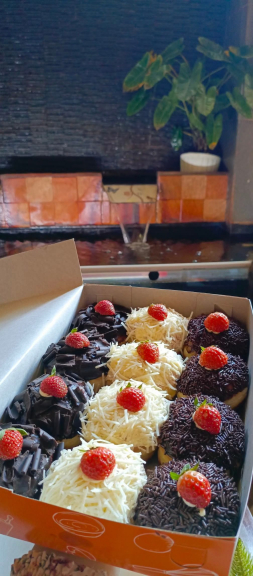 donat dengan tambahan kentang dan limpahan toping yang dominan coklat dan keju