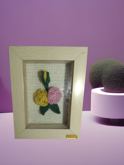 Bunga mawar rajut yang dirangkai dalam bingkai kayu tiga dimensi