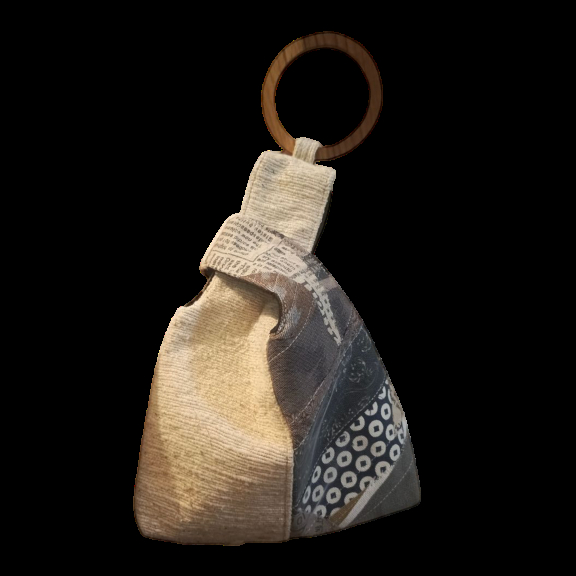 Tas mungil dengan desain feminin dan pegangan gelang kayu yang khas. Kombinasi kain denim biru dan motif bunga vintage dari limbah tekstil menjadikannya koleksi spesial. Cocok sebagai aksesori fashion yang memperkuat kesan anggun namun tetap kasual.